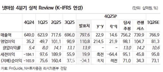 2026년 실적 개선 흐름도 이어질 것으로 내다봤다. 안 연구원은 “2026년 매출액은 3조1640억원으로 전년 대비 11.6% 증가하고, 영업이익은 4036억원으로 14.5% 늘어날 것”이라며 “상반기 중 ‘스톤에이지 키우기’, ‘일곱 개의 대죄: 오리진’, ‘SOL: enchant’, ‘몬길: 스타 다이브’ 등 4종의 기대작 출시를 앞두고 있어 국내 게임사 가운데 신작 모멘텀이 가장 강하다”고 설명했다.
