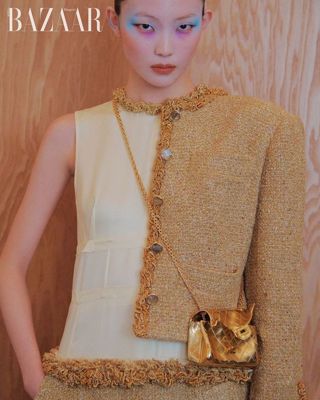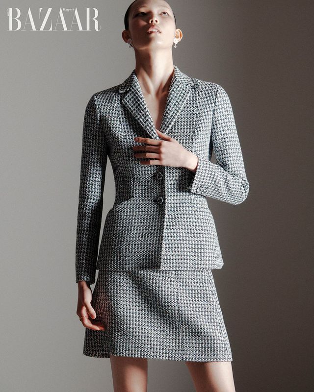 아래쪽 페이지: 트위드 재킷, 슬리브리스 드레스, 미니 사이즈 숄더백은 모두 Chanel.