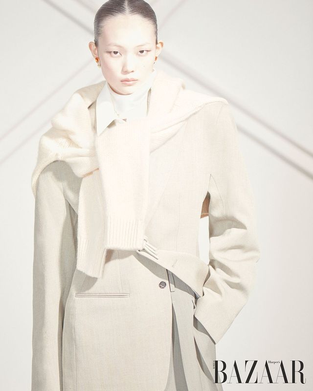 위쪽 페이지: 재킷, 화이트 셔츠, 이너로 착용한 터틀넥 톱, 어깨에 묶은 니트 톱, 팬츠, 귀고리는 모두 Bottega Veneta.