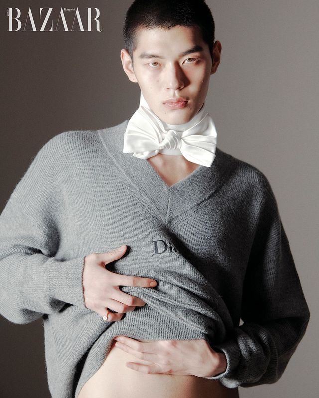 (위쪽부터) 지호가 착용한 니트 톱, 넥밴드, 반지, 기웅이 착용한 코트, 데님 팬츠, 넥밴드, 허리에 레이어드한 머플러, 스니커즈, 윤서가 착용한 재킷·스커트 세트업, 귀고리, 반지는 모두 Dior.