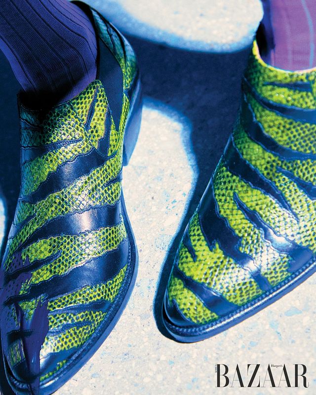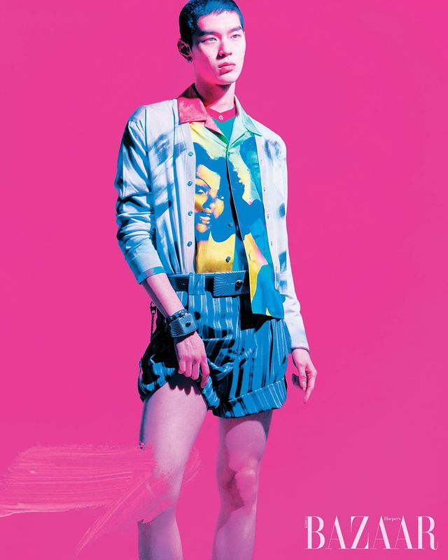 아래 페이지: 카디건, 프린트 셔츠, 이너로 착용한 톱, 쇼츠, 뱅글, 레더 팔찌, 벨트, 키 체인은 모두 Versace. (왼쪽) 양말, 애니멀 패턴 부츠는 Versace.