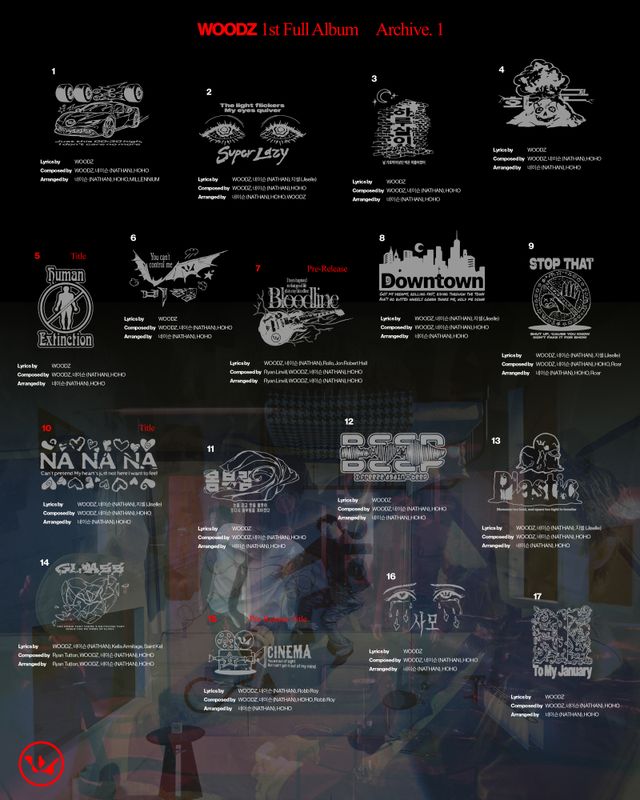 이번 앨범에는 ‘00:30’을 시작으로 ‘Super Lazy’, ‘하루살이’, ‘화근’, ‘Human Extinction’, ‘비행’, ‘Bloodline’, ‘Downtown’, ‘STOP THAT’, ‘NA NA NA’, ‘몸부림’, ‘BEEP’, ‘Plastic’, ‘GLASS’, ‘CINEMA’, ‘사모’, ‘To My January’까지 총 17개의 트랙이 수록돼 우즈의 폭넓은 음악 스펙트럼을 예고한다. 이 가운데 선공개곡은 ‘CINEMA’와 ‘Bloodline’으로, 특히 선공개 타이틀 곡 ‘CINEMA’는 앞서 우즈의 단독 콘서트에서 선보여 팬들의 뜨거운 호응을 얻은 바 있다.