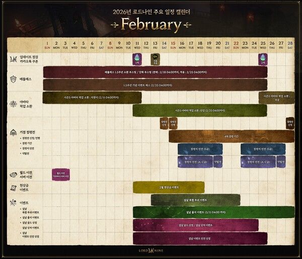 이번에 공개된 로드나인의 2월 캘린더에는 1.5주년 기념 배틀패스 2종과 지팡이, 단검 등의 아바타 픽업 기간, 4차 거점 점령전 등의 중요 이벤트와 콘텐츠 일정이 담겨 있다. 또한, 월드 서버 이전, 설날을 기념한 각종 이벤트 계획도 공개됐다. 이에 따르면 설날 이벤트는 오는 11일부터 총 4종이 진행될 예정이다.