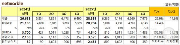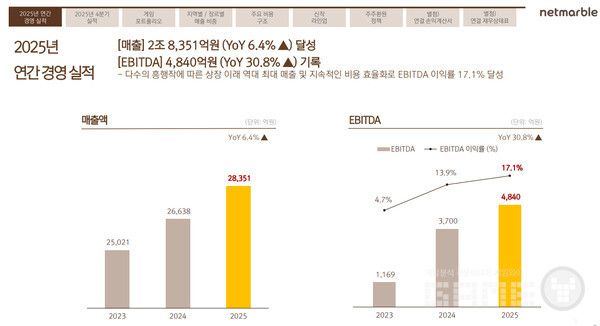 넷마블은 2025년 4분기 연결기준 매출 7,976억원, 영업이익 1,108억원을 기록했다고 5일 밝혔다. 연간 매출은 2조 8,351억원으로 집계돼 분기·연간 기준 모두 사상 최대치를 경신했다.