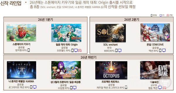 2026년에는 총 8종의 신작을 순차적으로 선보일 계획이다. 1분기에는 ‘스톤에이지 키우기’와 ‘일곱 개의 대죄: Origin’을, 2분기에는 ‘SOL: enchant’와 ‘몬길: STAR DIVE’를 출시한다. 하반기에는 ‘나 혼자만 레벨업: 카르마’, ‘샹그릴라 프론티어: 일곱 최강종’, ‘프로젝트 옥토퍼스’, ‘이블베인’을 선보일 예정이다. 하반기 라인업의 구체적인 일정은 내·외부 테스트 결과에 따라 조정될 수 있으며, 2분기 실적 발표 전후 추가 안내가 이뤄질 예정이다.