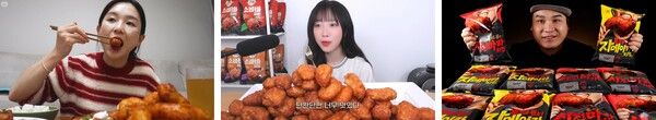 먹방 메가 크리에이터들이 CJ제일제당의 치킨 신제품을 즐기는 장면(왼쪽부터 햄지, 쯔양, 떵개떵)