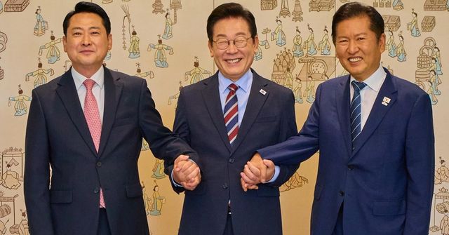 이재명(가운데) 대통령이 지난달 8일 서울 용산 대통령실 청사에서 열린 여야 지도부 오찬 회동에서 정청래(오른쪽) 더불어민주당 대표, 장동혁(왼쪽) 국민의힘 대표와 손을 맞잡고 기념 촬영을 하고 있다. / 뉴스1