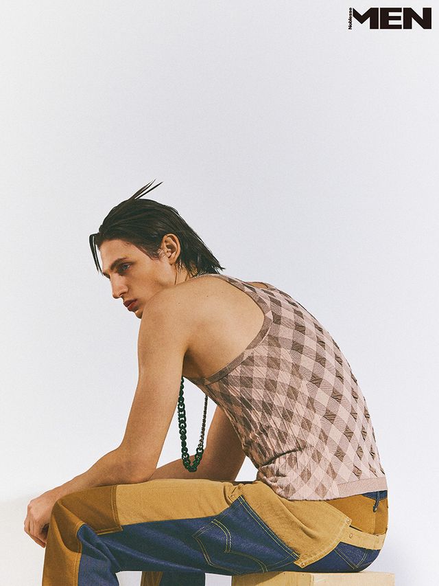체크 슬리브리스 톱 Acne Studios, 패치워크 데님 팬츠 Junya Watanabe Man, 체인 네크리스 스타일리스트 소장품.