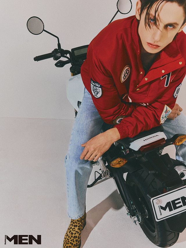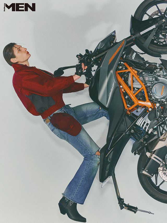 레드 아노락과 연청 데님 팬츠 모두 Drole de Monsieur, 아이보리 이너 톱 Gucci, 레오퍼드 부츠 Jimmy Choo. MSX 그롬 Honda.