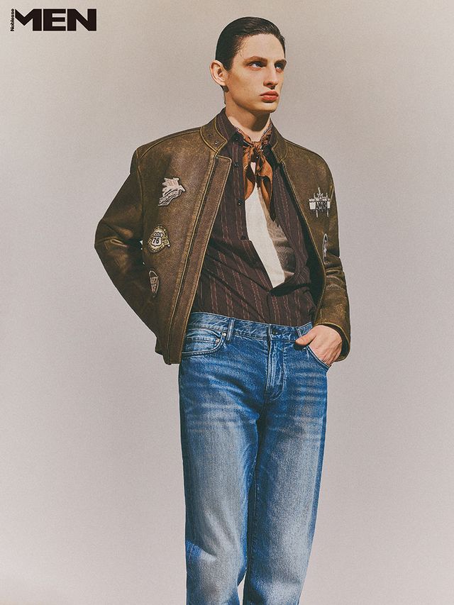 패치 디테일 브라운 레더 재킷과 스트라이프 셔츠 모두 Amiri, 데님 팬츠 John Varvatos, 페이즐리 패턴 스카프 Valentino Garavani, 이너 톱 스타일리스트 소장품.