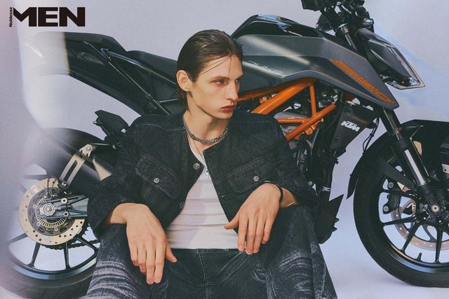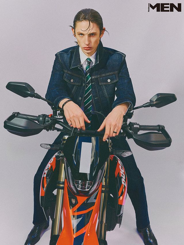 남성 데님 재킷과 팬츠, 화이트 셔츠, 스트라이프 타이 모두 Dior, 블랙 레더 부츠 Christian Louboutin.