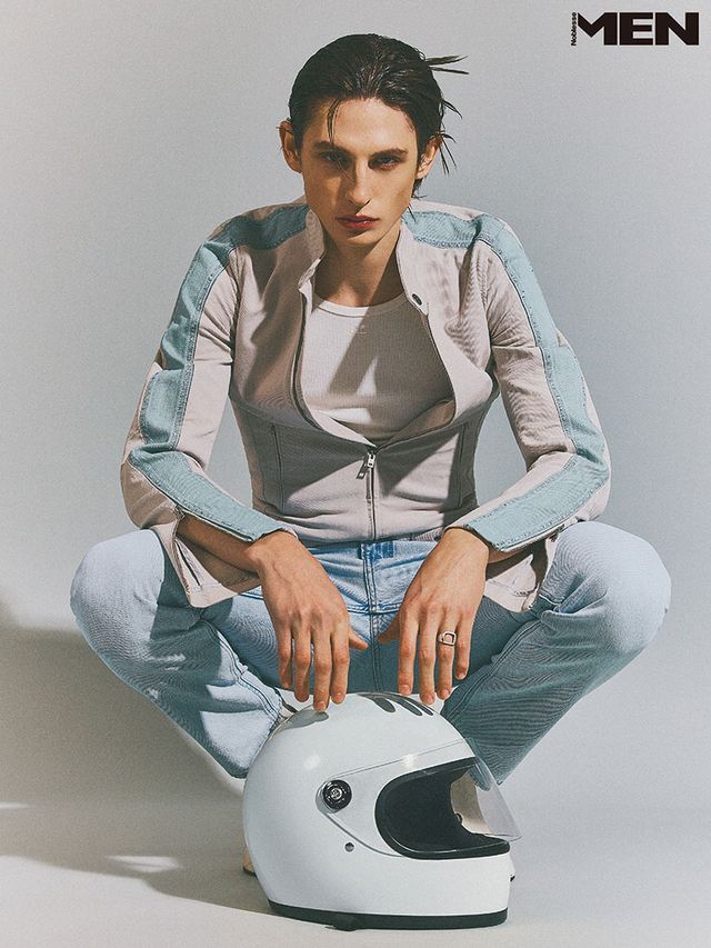 벨트 디테일 라이더 재킷 Acne Studios, 화이트 슬리브리스 톱과 레더 부츠 모두 Courre`ges, 연청 데님 팬츠 Calvin Klein, 실버 링 TomWood.