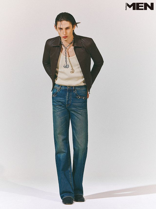 브라운 가죽 재킷과 슬리브리스 톱, 홀스빗 장식 데님 팬츠, 블랙 GG 로고 로퍼, 실버 체인 네크리스 모두 Gucci.