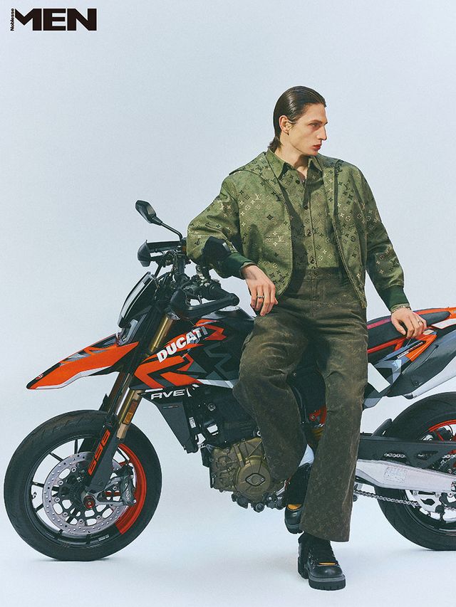 올리브그린 블루종과 셔츠, 모노그램 프린트 데님 팬츠, 레이스업 슈즈, 실버 링과 브레이슬릿 모두 Louis Vuitton.