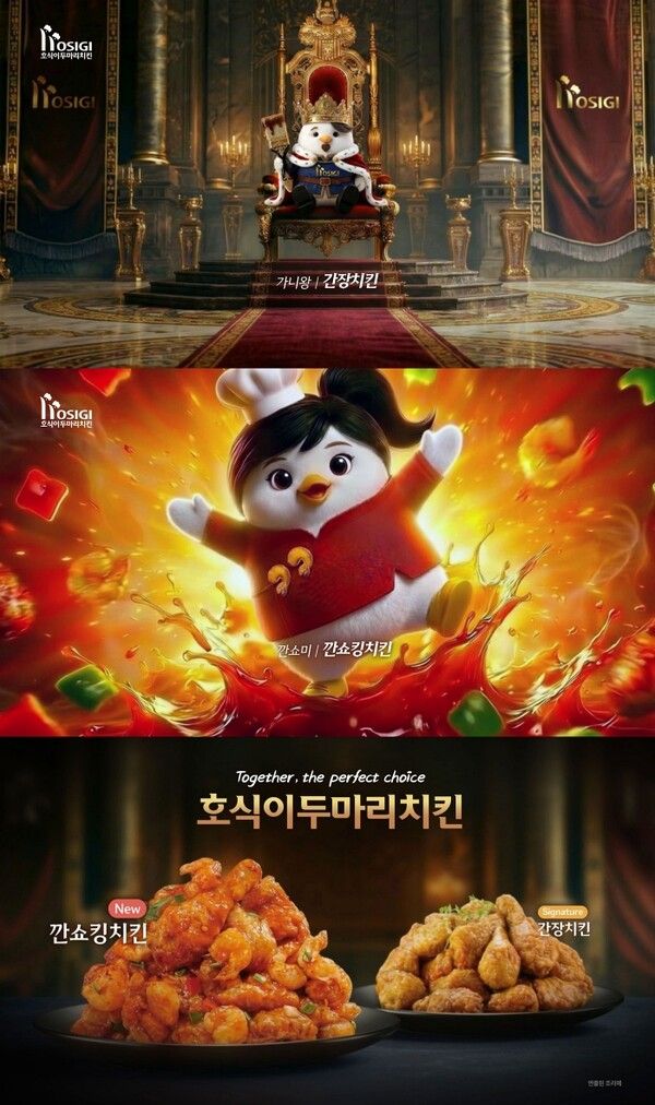 이번 광고는 브랜드 캐릭터 세계관을 기반으로 제작된 AI 영상으로, 호식이두마리치킨의 신메뉴 깐쇼킹치킨과 대표 메뉴인 간장치킨의 조합을 중심으로 한 스토리형 콘텐츠다. ‘호식이 왕국’이라는 판타지 콘셉트 속에서 신메뉴 '깐쇼킹치킨'의 캐릭터 ‘깐쇼미’가 탄생하는 과정을 담아내며, 두 메뉴가 만들어내는 조합의 매력을 직관적으로 전달한다.