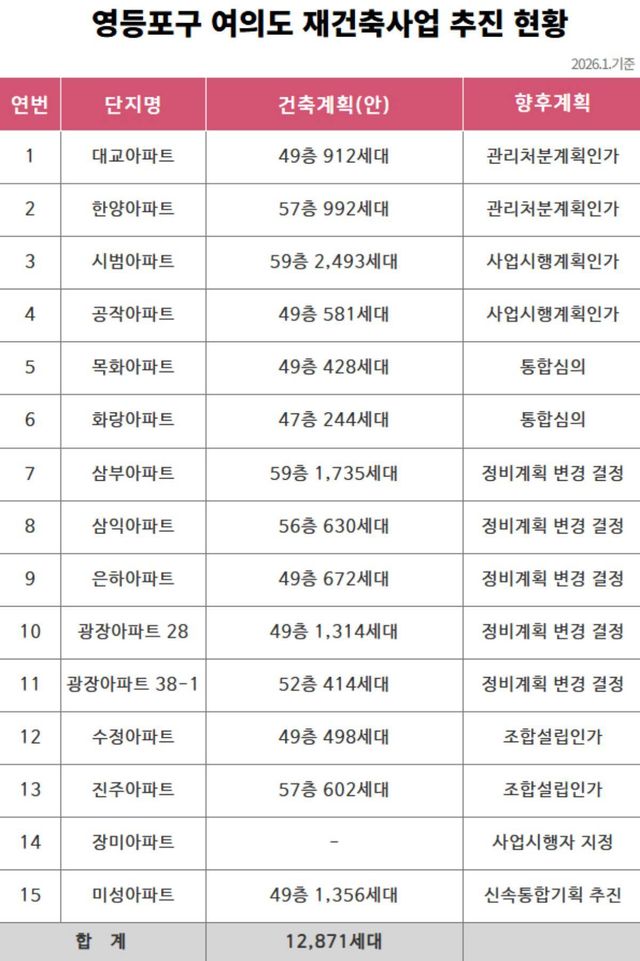 여의도 전역에서 동시다발적으로 진행되는 이번 변화는 아파트 재건축을 넘어 서울의 도시 공간 구조를 현대화하는 상징적 사례가 될 것으로 보인다. 주거와 업무, 상업 기능이 유기적으로 결합된 새로운 여의도의 모습은 향후 서울의 다른 노후 도심 정비사업에도 긍정적인 이정표가 될 것으로 기대된다.