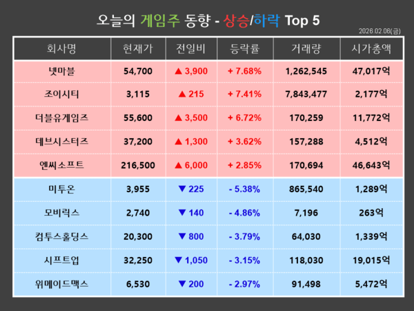 넷마블이 금일(6일) 전거래일 대비 7.68%(3,900원) 상승한 54,700원에 거래를 마쳤다. 개인이 167,722주를 순매도한 반면, 기관과 외국인이 각각 91,422주, 47,032주를 순매수하며 종일 상승장을 기록했다.