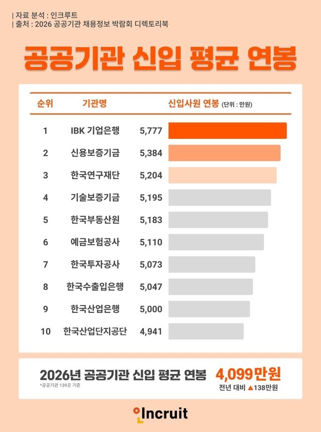 공공기관 신입 평균 연봉이 4100만원 수준까지 오르며 최근 5년 사이 가장 큰 폭의 상승세를 기록한 것으로 나타났다. HR테크 기업 인크루트가 '2026 공공기관 채용정보박람회' 디렉토리북을 활용해 공공기관의 신입 연봉을 취합·분석한 결과다.