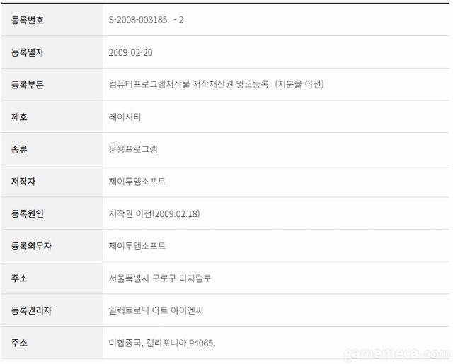 ▲ 레이시티 저작권 등록 현황 (자료출처: 한국저작권위원회 공식 홈페이지)
