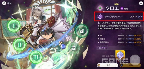 전투력 30만 돌파 당시 쿠로에 4돌, 카리아 3돌, 엘피나 2돌, 세티아 1돌이다. 쿠로에의 경우 4돌을 달성하면서 피스에이드 스킬이 3레벨에서 4레벨로 상승했다. 6돌까지 달성하면 힐링 웨이브가 400%에서 500%로 증가하고, 피스에이드가 4레벨에서 5레벨로, 힐링 웨이브가 3레벨에서 4레벨로 각각 강화된다.