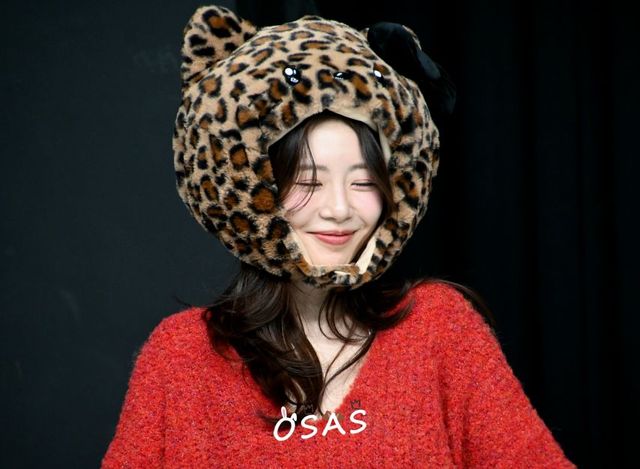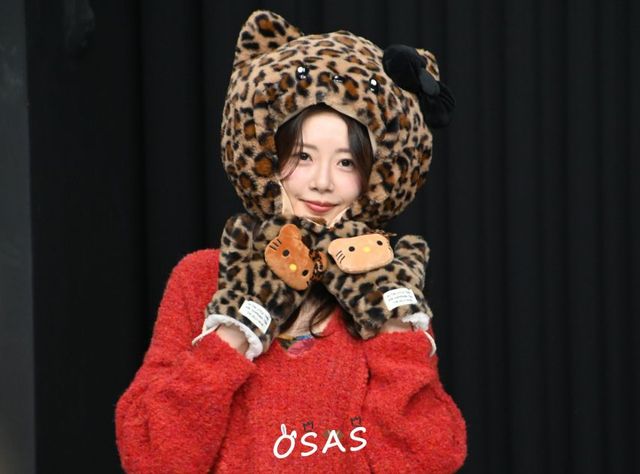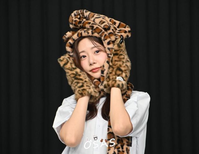 스타일링의 핵심은 시각적으로 강렬한 에너지를 선사하는 레오파드 패턴의 퍼 모자와 장갑입니다. 보송보송한 질감의 퍼 소재는 포근한 느낌을 주면서도, 선명한 호피 무늬가 더해져 키치하고 와일드한 매력을 자아냅니다. 특히 모자와 장갑이 일체형으로 이어지는 듯한 구성은 지유의 작은 페이스 라인을 감싸며 귀여운 '맹수' 같은 반전 매력을 선사합니다.