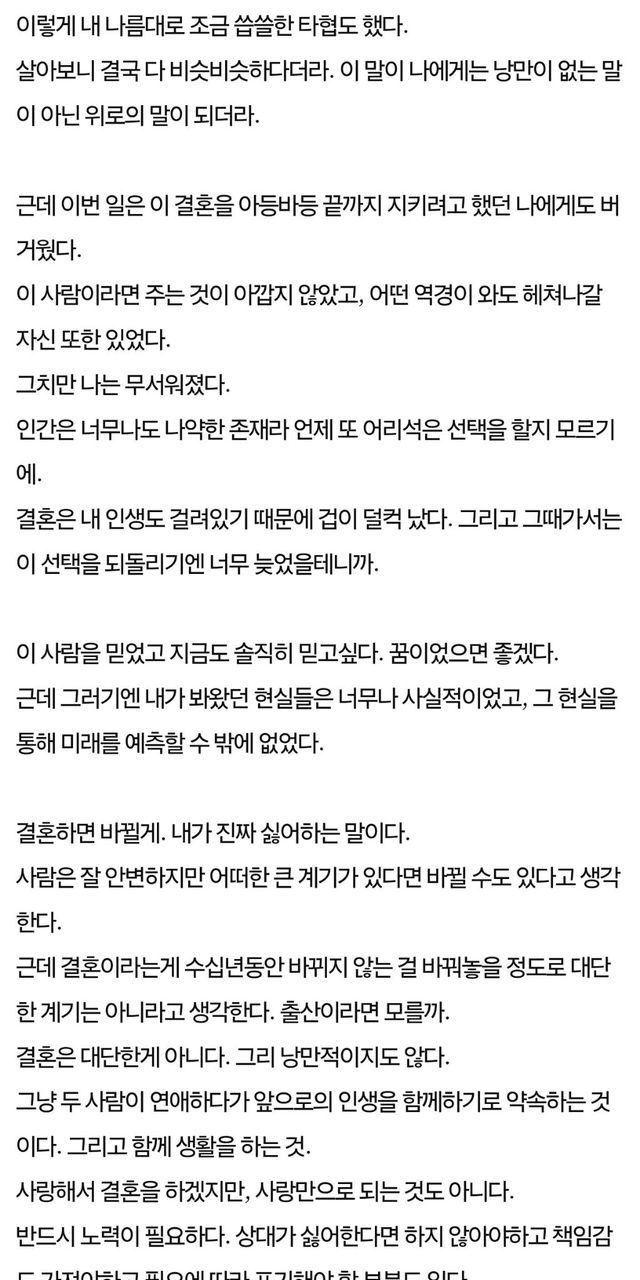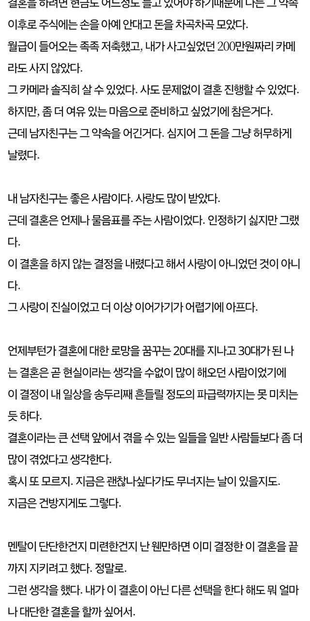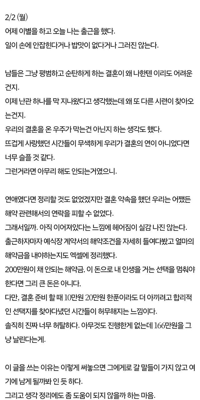 A씨는 "축복받아야 할 기간이 오히려 서로에게 상처를 주는 지옥 같은 시간이 되었다"며, 주변의 기대와 이미 진행된 예식 예약 등을 고려해 끝까지 버텨보려 했으나 결국 서로를 위해 멈추기로 했다고 밝혔습니다. 특히 모든 것이 준비된 상태에서 내린 결정이라 그에 따른 정신적 충격과 허탈함이 상당했음을 덧붙였습니다.