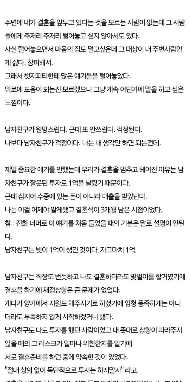 일생의 가장 행복한 순간이어야 할 결혼식을 단 3개월 앞두고 파혼이라는 가슴 아픈 선택을 한 한 여성의 사연이 전해지며 누리꾼들의 안타까움을 자아내고 있습니다.
