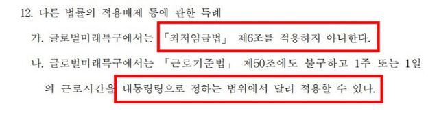 최근 구자근 국민의힘 의원이 대표 발의한 대구경북특별시법안에는 최저임금과 근로시간 등 적용을 배제할 수 있도록 한 특례가 포함됐다. ‘글로벌미래특구에서는 최저임금법 제6조를 적용하지 아니한다’는 조항이 담긴 것이다. 또 ‘근로기준법 제50조에도 불구하고 1주 또는 1일의 근로시간을 대통령령으로 정하는 범위에서 달리 적용할 수 았다’고 적시됐다. 이 법안이 통과되면 최저임금을 적용하지 않고 근로 시간도 현행법보다 더 많이 적용하는 게 가능해진다.