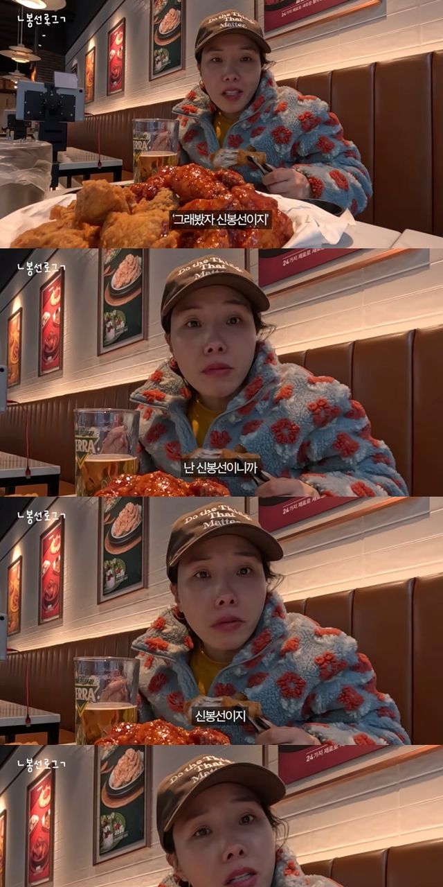 영상에서 신봉선은 집 근처 도서관에서 책을 빌린 뒤 치킨집으로 향했다. 그는 “혼자서 늘 해보고 싶었던 게 있다. 낮에 맥주와 치킨을 혼자 먹어보고 싶었다”며 “새해가 됐으니까 안 해봤던 걸 해보고 싶었다. 오늘은 운동 스케줄도 없고 운전할 일도 없어서 나왔다”고 기쁜 마음을 전했다.