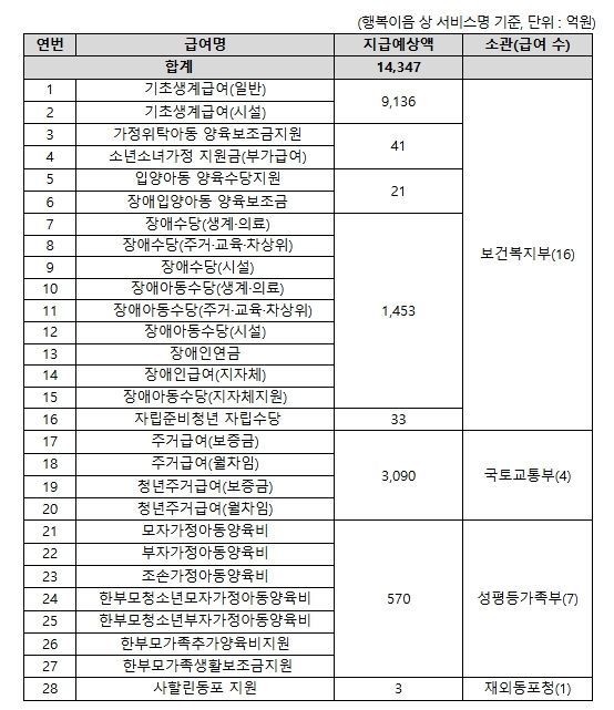조기지급 대상은 생계급여와 주거급여를 비롯해 장애수당·장애인연금, 입양아동 양육수당, 자립준비청년 자립수당, 가정위탁아동 양육수당, 한부모가족 지원, 사할린동포 지원 등 총 4개 부처 소관 28종 복지급여로, 보건복지부·국토교통부·성평등가족부·재외동포청이 함께 참여한다.