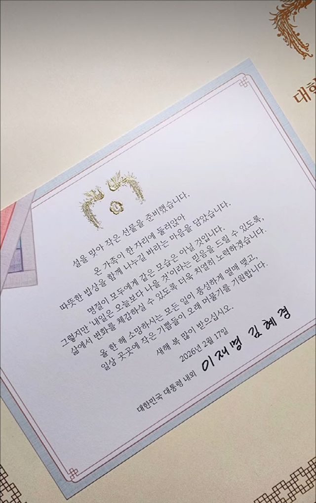 영상 속 선물 세트에는 식기 세트와 떡국떡 등이 담겨 있었다. 또 이 대통령과 김혜경 여사의 이름으로 “온 가족이 한 자리에 둘러앉아 따뜻한 밥상을 함께 나누길 바라는 마음을 담았습니다”라며 “명절이 모두에게 같은 모습은 아닐 것입니다. 그렇지만 ‘내일은 오늘보다 나을 것’이라는 믿음을 드릴 수 있도록 삶에서 변화를 체감하실 수 있도록 더욱 치열히 노력하겠습니다”라고 적혔다.