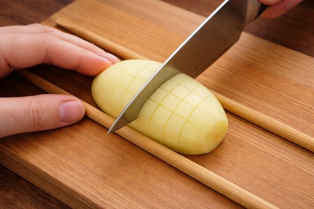 감자꽃 칼질 방법. 감자 양옆에 나무젓가락을 하나씩 놓고 칼질을 한다. 이때 젓가락이 받침 역할을 해 칼이 바닥까지 내려가지 않으면서 감자가 통째로 유지된다. 기사 내용 토대로 AI툴 활용해 제작한 자료사진.