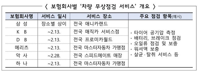 보험회사별 ‘차량 무상점검 서비스’ 개요 / 금융감독원 제공