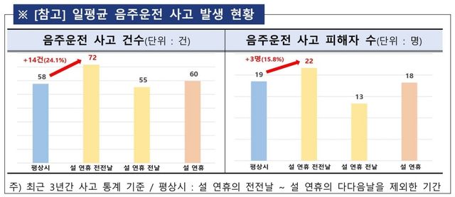 사고 유형별로 보면 음주운전과 무면허운전 증가세가 두드러졌다. 본격적인 귀성 직전인 설 연휴 전전날 음주운전 사고는 하루 평균 72건으로 평상시보다 24.1% 늘었고 이로 인한 피해자도 22명으로 15.8% 증가했다.