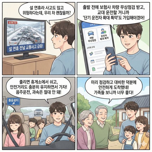 가족·친척과 교대로 운전하려면 단기 운전자 확대 특약을 통해 보장 범위를 넓혀두는 방식이 대안이 될 수 있다. 설 연휴 기간 중 다른 사람의 차량을 운전할 가능성이 있다면 다른 자동차 운전 특약으로 대비할 수 있으며 본인 또는 운전자 범위에 포함된 배우자가 운전 중 사고를 낸 경우 대인, 대물, 자기신체사고 보장이 적용된다.