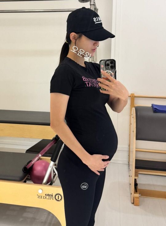 특히 몸에 밀착된 상의와 레깅스 차림 속에서도 무리 없는 자세와 안정된 포즈가 눈길을 끌며, 임신 중에도 꾸준히 자기 관리를 이어가고 있는 모습이 인상적이다. 한 손으로 배를 감싸 쥔 채 잔잔한 미소를 머금은 표정에서는 예비 엄마의 여유와 따뜻한 분위기가 고스란히 전해진다.