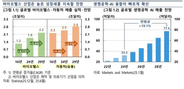9일 한은이 발표한 '첨단 바이오헬스 산업 육성방안' 보고서에 따르면 글로벌 바이오헬스 시장은 향후 5년간 연평균 5.0%의 고성장이 전망된다. 이는 국내 주력 산업인 자동차 성장률(2.7%)의 2배에 달하는 수치다.