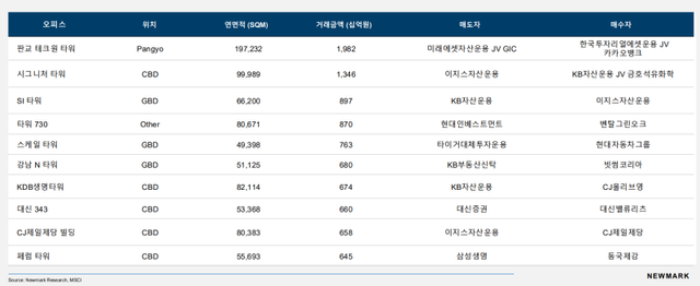 이밖에도 △상암 DMC타워 △구로 G밸리 플라자 △누디트 서울숲 △팩토리얼 성수 등이 작년 기타권역에서 거래된 주요 오피스 자산으로 이름을 올렸다.