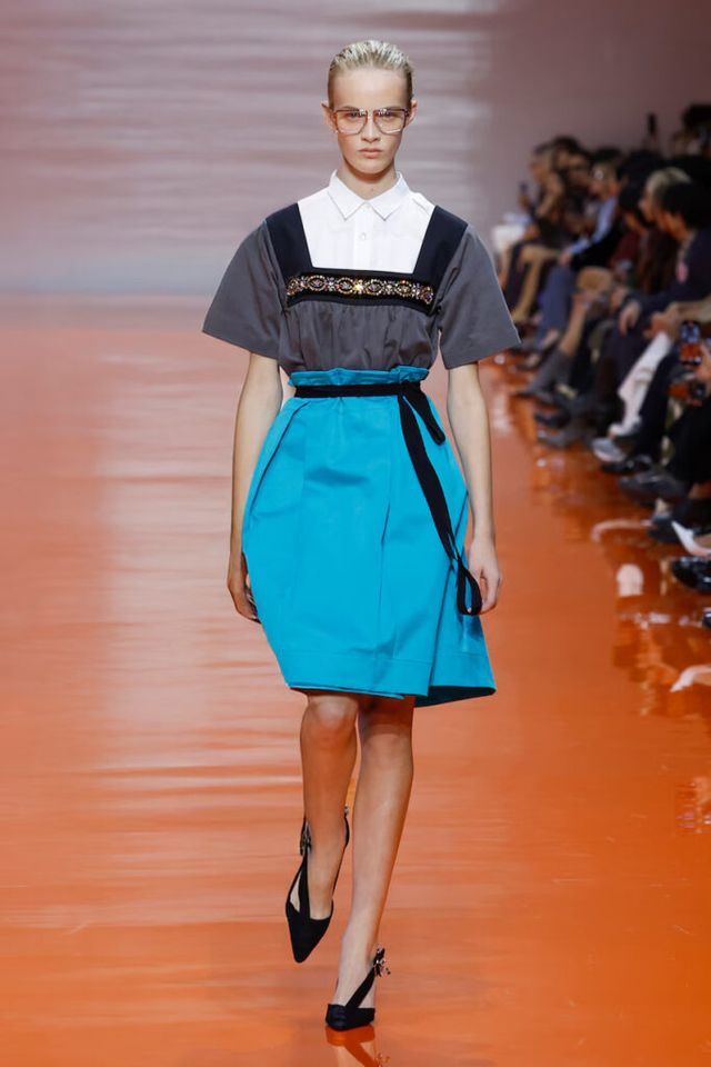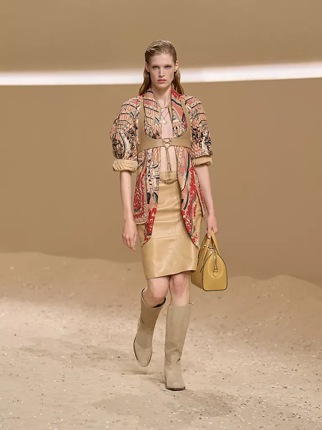 2026 S/S 컬렉션에서 살펴본 것처럼 올해의 리젠시 코어는 전체적인 실루엣보다 한 점의 디테일에 집중합니다. 한눈에 알아볼 수 있는 엠파이어 웨이스트 드레스는 줄어들고, 리젠시 시대의 스타일 중 하나에만 집중하는 방식이 포인트입니다. 에르메스와 프라다의 컬렉션을 보면 이해하기 쉽죠. 에르메스(Hermès)는 스퀘어 네크라인에 집중합니다. 크롭 톱이나 스퀘어 라인의 하네스를 입고, 패턴 스카프를 레이어드하는 방식으로 말이죠. 프라다(Prada)는 스퀘어 네크라인을 살리되 셔츠와 레이어드하는 방식을 택했고, 파스텔 컬러 톤은 유지하면서 실루엣에는 변주를 줬습니다. 여기에 롱 글러브를 함께 매치해 우아함을 배가했죠.