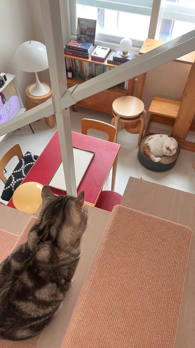 이사를 한 지는 얼마 되지 않았는데요. 집을 구할 때, 수직 공간을 좋아하는 고양이들을 위해 복층 구조의 집을 찾는 것이 중요한 기준이었어요. 결국 직사각형 형태의 복층 구조 집을 찾았어요. 실제로 호두와 모카는 위층으로 올라가 아래 공간을 보는 걸 좋아하더군요. 또 창문이 크고 창밖에 볼거리가 있는 집이어야 했어요. 고양이들이 창밖을 구경하는 걸 즐기기 때문이죠. 이 집은 그 조건도 충족해요.