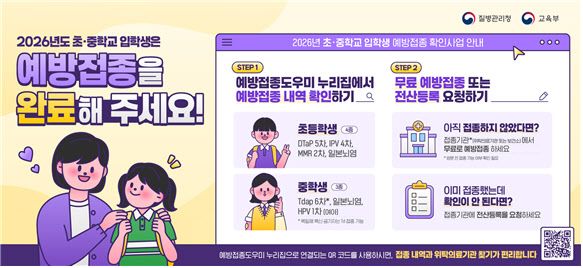 임승관 질병청장은 “초·중학교 입학생은 감염에 취약할 수 있는 연령대인 만큼 입학 전 예방접종 기록 확인과 접종 완료로 학교생활을 안전하게 시작하기를 바란다”고 당부했다.