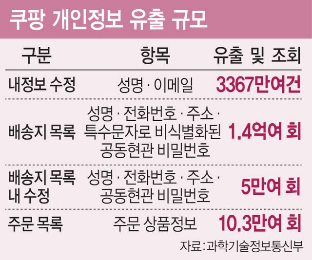 조사단에 따르면 ‘내 정보 수정’ 페이지를 통해 성명·이메일이 포함된 이용자 정보 3367만3817건이 유출된 것으로 확인됐다. 또 성명·전화번호·배송지 주소·공동현관 비밀번호 등이 포함된 ‘배송지 목록’ 페이지는 1억4805만6502회 조회됐고, 주문 상품 정보가 담긴 ‘주문 목록’ 페이지도 10만2682회 조회된 것으로 집계됐다. 배송지 목록에는 계정 소유자 본인 외에도 가족·지인 등 제3자의 개인정보가 다수 포함돼 있었다는 설명이다.