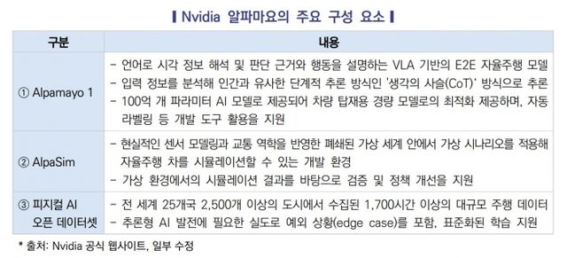 김 선임연구원은 "과거에는 각 기업이 각자 데이터를 수집하고 모델을 다듬는 방식이었지만, 이제는 엔비디아가 마련한 '표준 도로' 위에서 소프트웨어를 최적화하는 국면에 들어섰다"며 "특히 자체 생태계 구축이 어려운 후발 완성차 기업들에게 알파마요는 개발 기간을 획기적으로 줄일 수 있는 선택지가 될 것"이라고 분석했다.