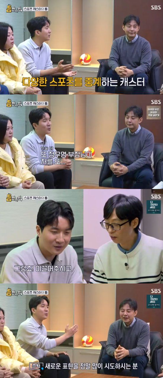 정우영과 이준혁은 각각 캐스터 일을 시작한지 23년, 13년이 됐다고. 현재 부장 자리에 있는 정우영을 향해 차장(대우) 이준혁은 "캐스터계 레전드"라고 추켜세웠다.