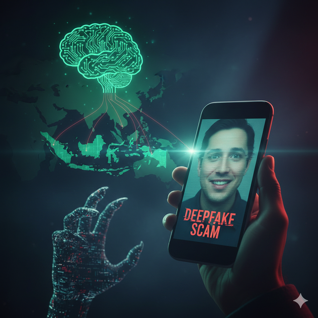 딥페이크 사기를 의미하는 스마트폰 화면 속 가짜 인물 얼굴과 ‘DEEPFAKE SCAM’ 문구, 동남아시아 지도 위에 연결된 AI 네트워크 그래픽이 표현된 이미지. 제미나이 AI 생성 이미지