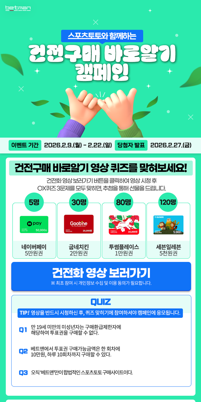 먼저 ‘건전구매 바로알기 영상 퀴즈’ 이벤트는 캠페인 영상 시청 후 제시되는 OX 퀴즈 3문항을 모두 맞힌 고객을 대상으로 추첨을 통해 경품을 제공한다. 당첨자는 네이버페이 5만 원권(5명), 굽네치킨 2만원권(30명), 투썸플레이스 1만원권(80명), 세븐일레븐 5000원권(120명)을 받을 수 있다.