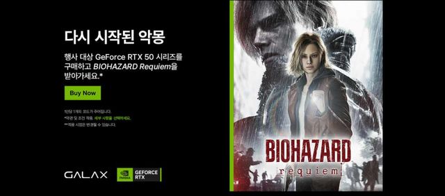 그래픽카드 전문 제조기업 갤럭시 마이크로시스템즈의 한국 지사 갤럭시코리아가 지포스 RTX 50 시리즈 구매 고객 대상 바이오하자드 레퀴엠 번들 증정 프로모션을 진행한다. 기간은 2026년 2월 10일부터 3월 16일까지다.