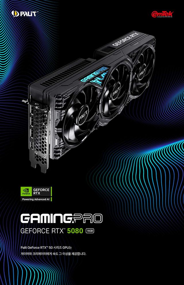 PALIT 지포스 RTX 5080 GAMINGPRO D7 16GB 이엠텍은 텐서 코어와 RT 코어 기반 기능을 지원하며, 쿨링 설계로 TurboFan 4.0, 베이퍼 챔버, 복합 히트파이프 구성을 포함한다.