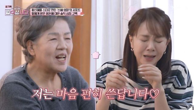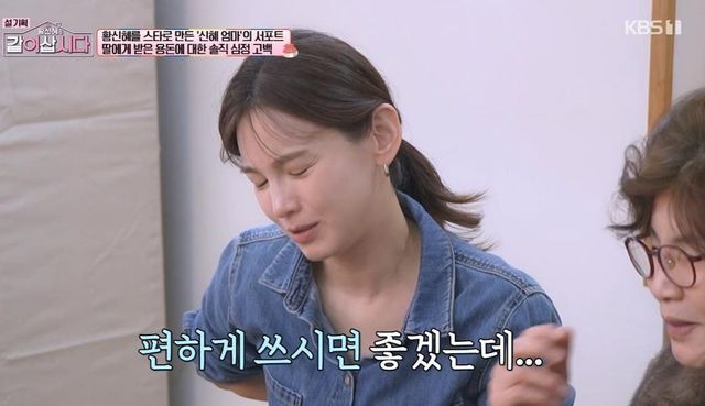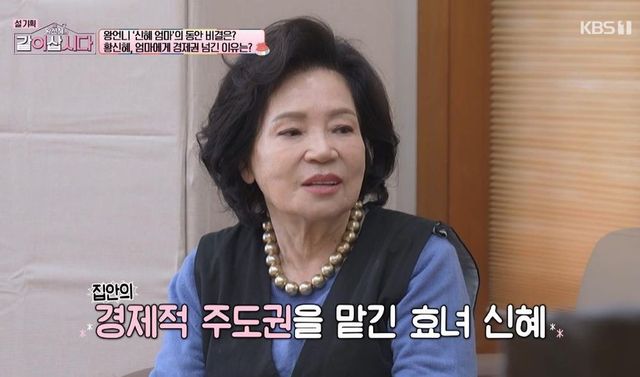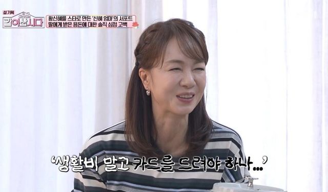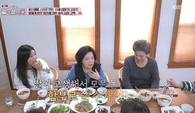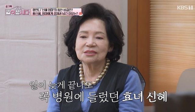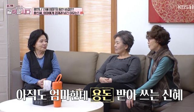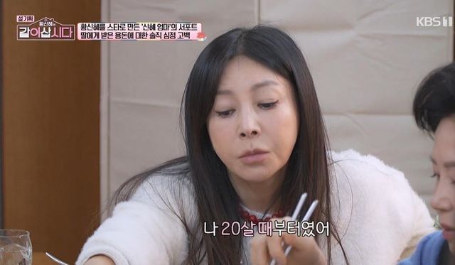 황신혜 어머니는 “딸이 20살인 데뷔 초부터 30살 때까지 매니저 역할을 했다”라며 “딸이 돈 좀 쓰라고 해도 못쓰겠다. 남편 돈은 앉아서 받고 자식 돈은 서서 받는다는 말이 있지 않냐. 나한테 돈 줘도 안 쓴다고 카드를 주는데도 못쓴다”라고 털어왔다.