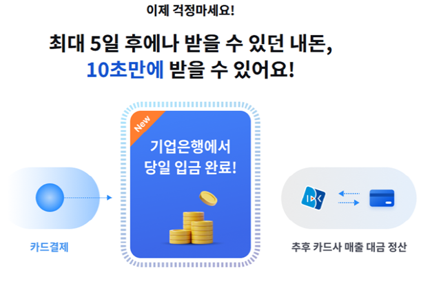 ‘카드매출 바로입금 서비스’는 카드 결제 후 입금까지 2~5일 소요되던 카드결제대금을 별도 비용 없이 카드 가맹점에 즉시 입금해 주는 서비스다.